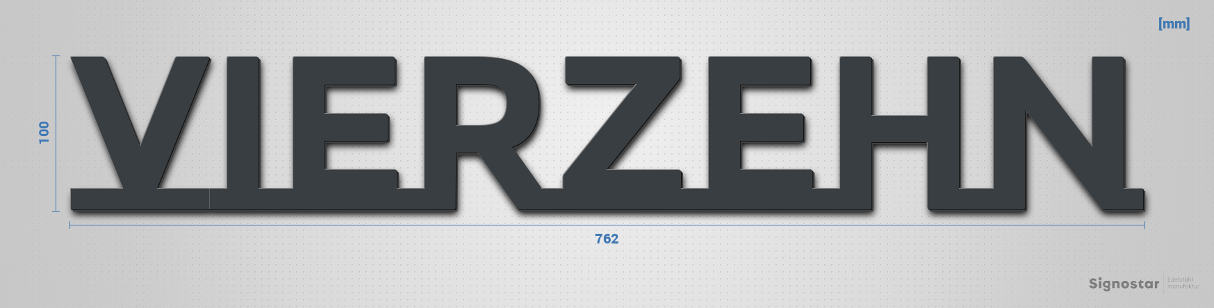 Hochwertiger, witterungsbeständiger Schriftzug "vierzehn" aus pulverbeschichtetem Edelstahl V2A (1.4301)