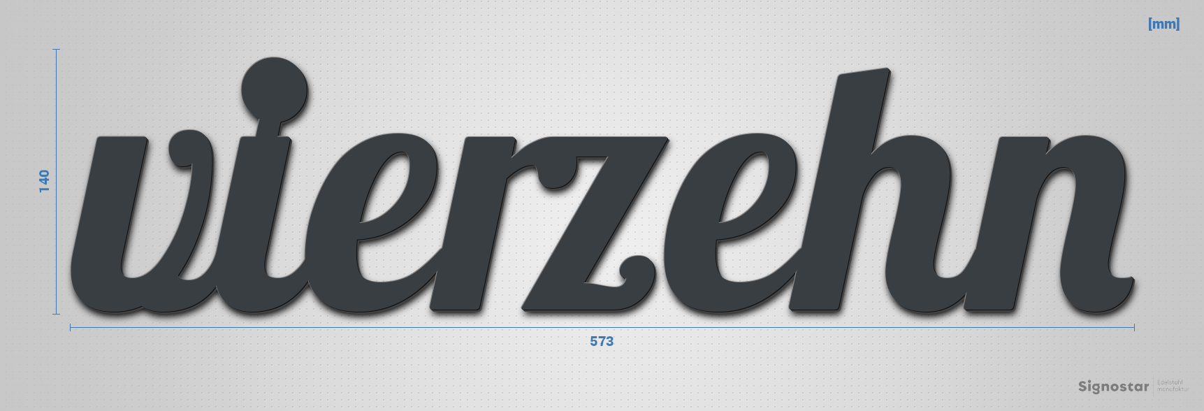Hochwertiger, witterungsbeständiger Schriftzug "vierzehn" aus pulverbeschichtetem Edelstahl V2A (1.4301)