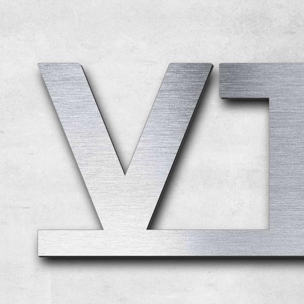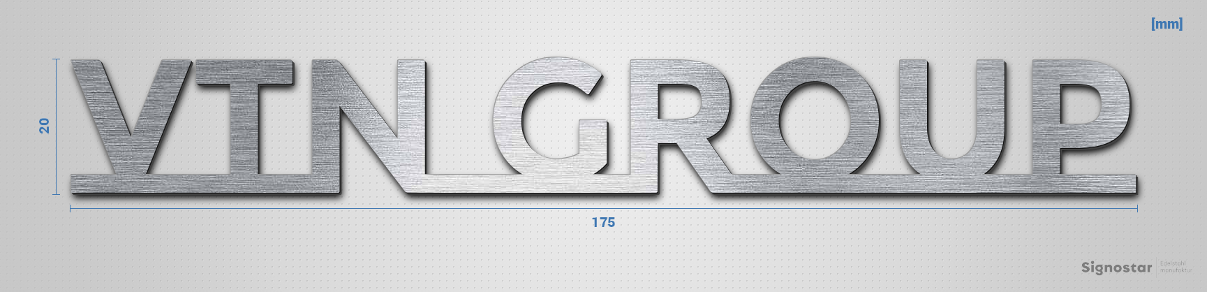 Hochwertiger, witterungsbeständiger Schriftzug "VTN Group" aus Acryl-Kunststoff mit Oberfläche in Edelstahl-Optik, gebürstet