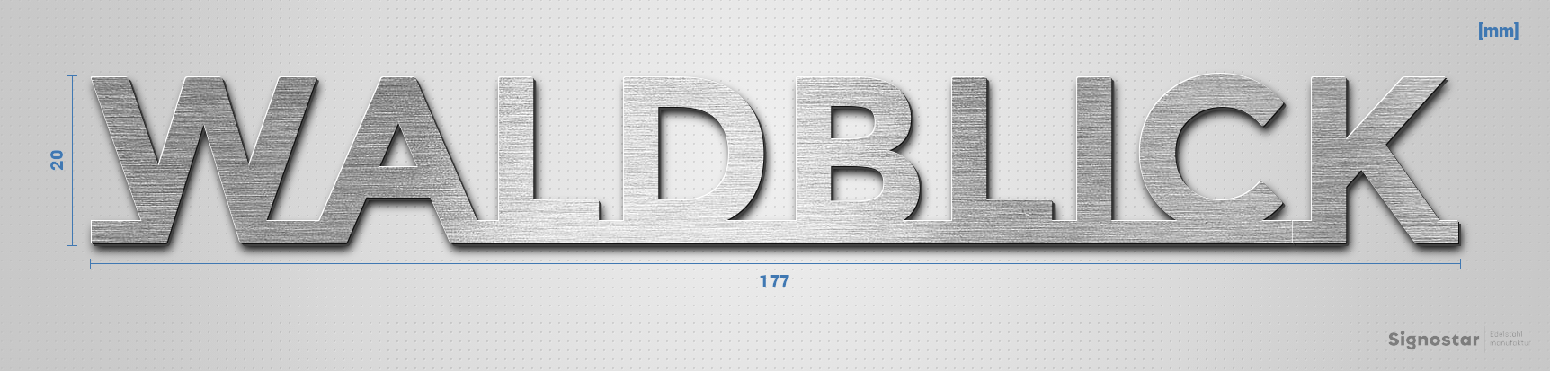 Hochwertiger, witterungsbeständiger Schriftzug "waldblick" aus gebürstetem Edelstahl V2A (1.4301)