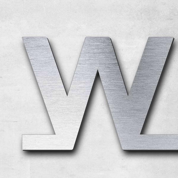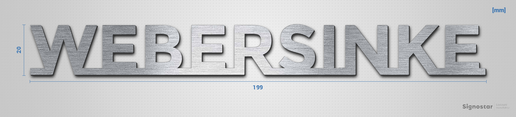 Hochwertiger, witterungsbeständiger Schriftzug "WEBERSINKE" aus Acryl-Kunststoff mit Oberfläche in Edelstahl-Optik, gebürstet
