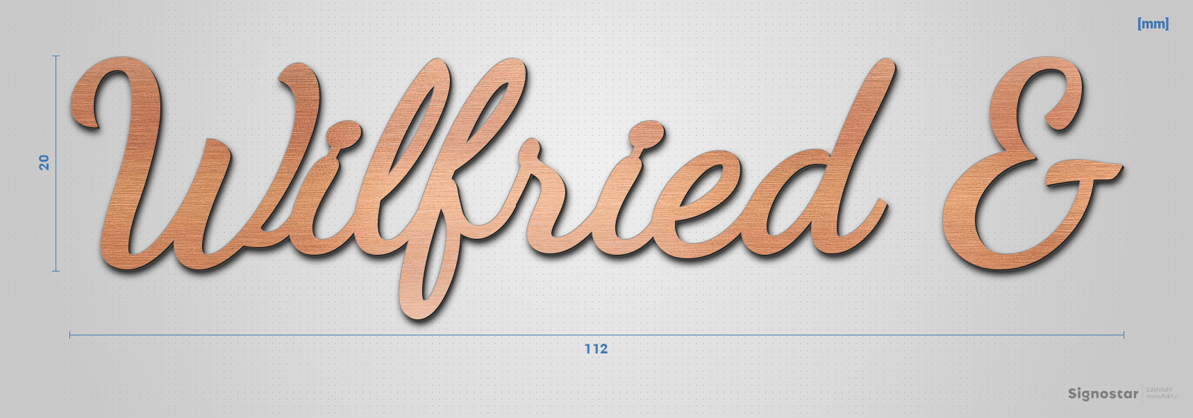 Schriftzug "Wilfried &" in Schriftart "Filigrano", Acryl-Kunststoff in Kupfer-Optik gebürstet - hoch