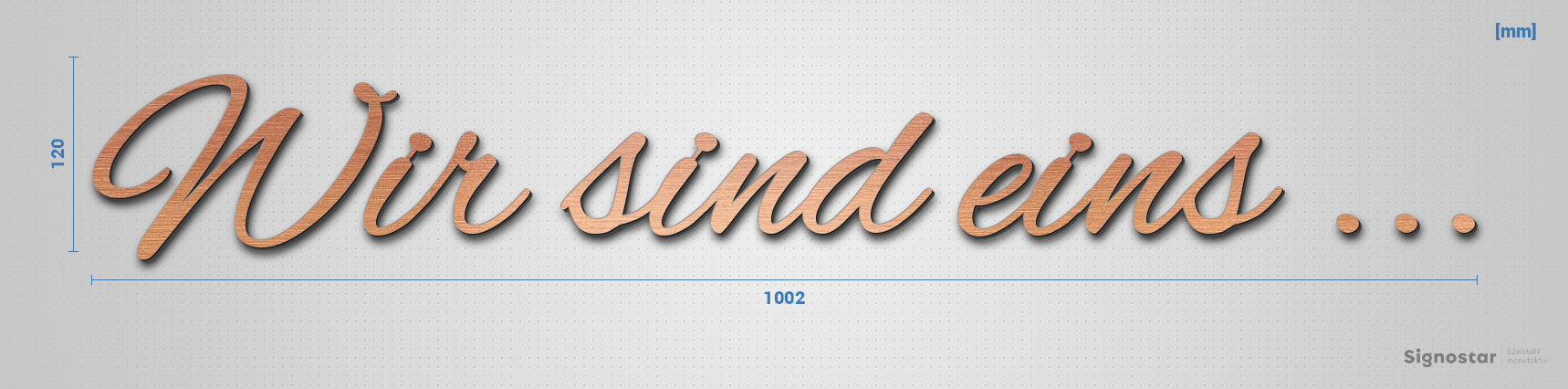 Schriftzug "Wir sind eins ..." in Schriftart "Jessari", Acryl-Kunststoff in Kupfer-Optik gebürstet -