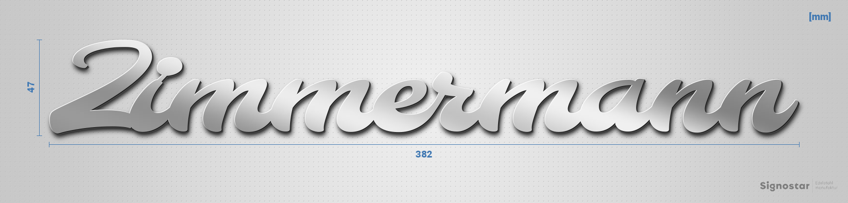 Schriftzug "Zimmermann" in Schriftart "Molarite", Edelstahl V2A spiegelpoliert - hochwertig & wetter